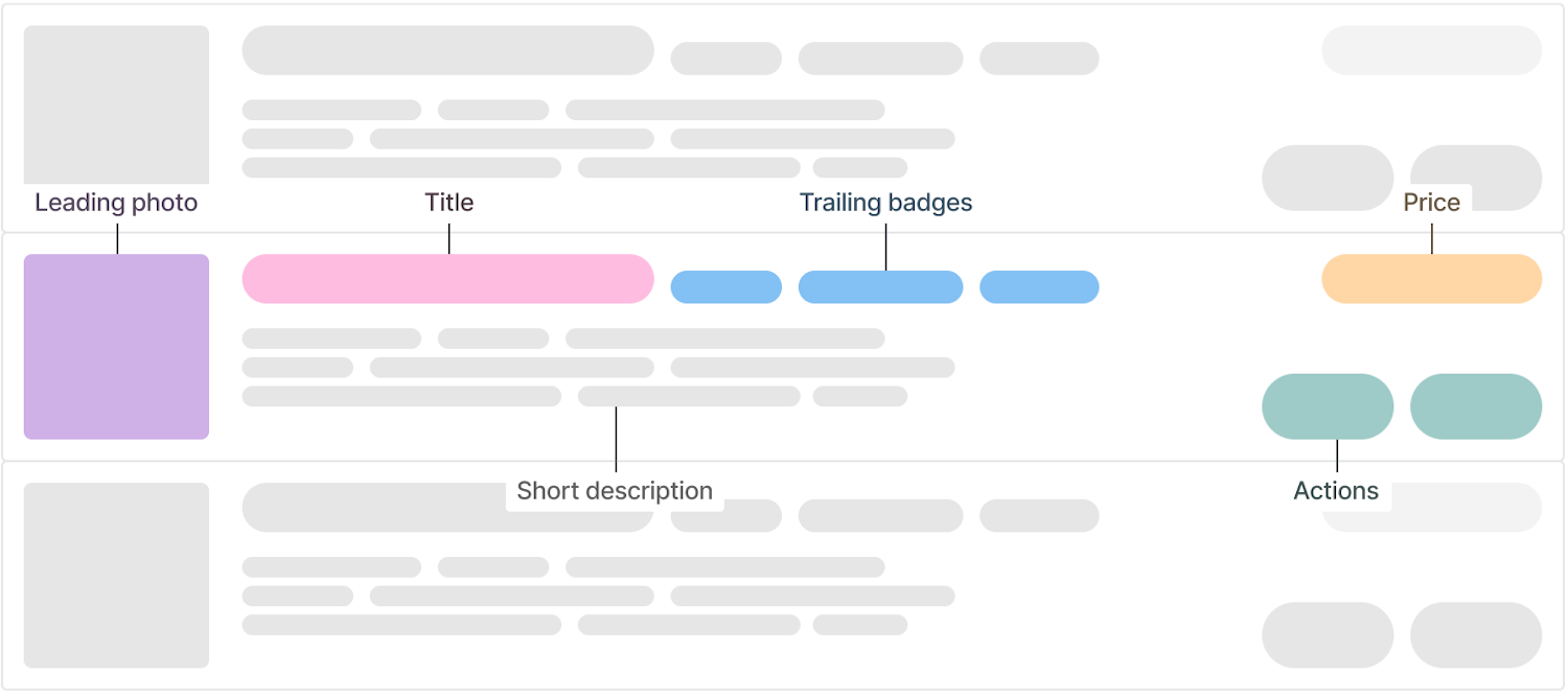 Each of the Simple List component’s list items features slots for a title, a short description, a price, and a few actions. The title can also have a leading photo and trailing badges placed before and after the title, respectively: